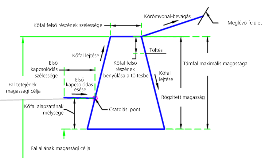 | Fal teteje | A kőfal teteje magasságának felülírására használható. A használathoz a Rögzített magasság bemeneti paraméternek Nem értékűnek kell lennie. A szintmagasság megadása a következő objektumtípusok esetében lehetséges: hossz-szelvények, 3D vonalláncok, vezérlővonalak és földmérési alakzatok. | Választható |