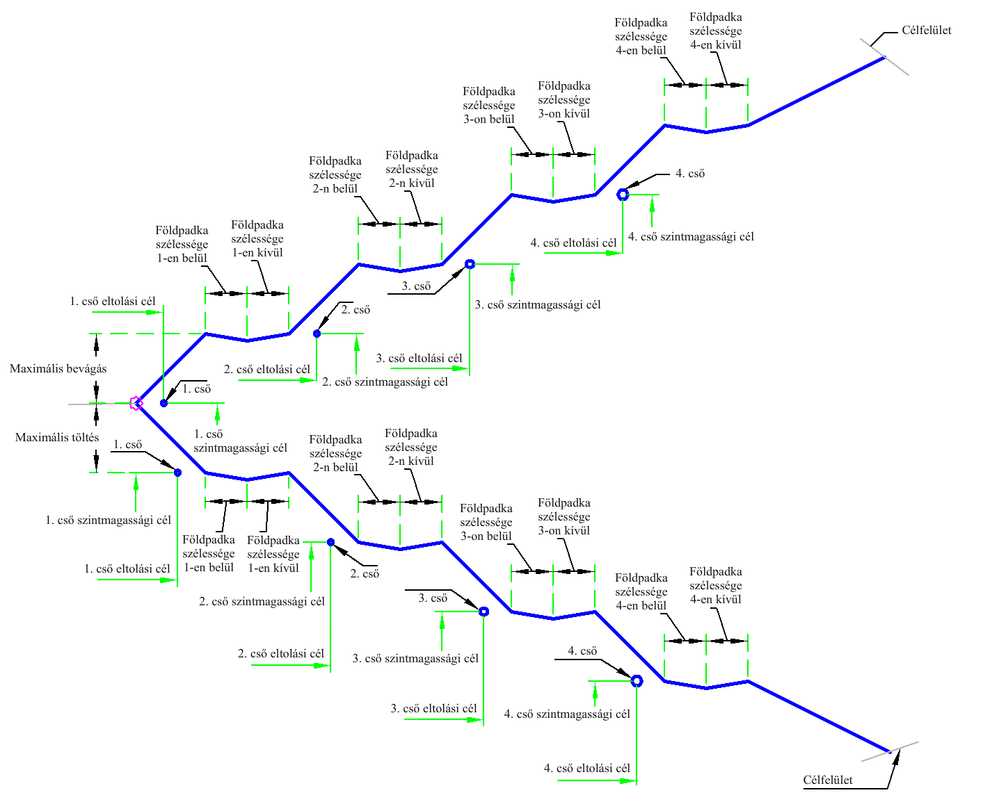 A földpadkáknál megadhatja a völgyek szélességeit. A program csöveket ad hozzá mindegyik földpadkánál. A célfelülethez képest a legutóbbi körömvonalesés különbözhet a földpadka esésétől.