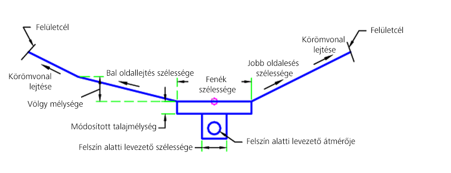 A VegetatedSwale alkotóelem létrehoz egy vegetációs völgyet az esővíz elvezetése céljából.
