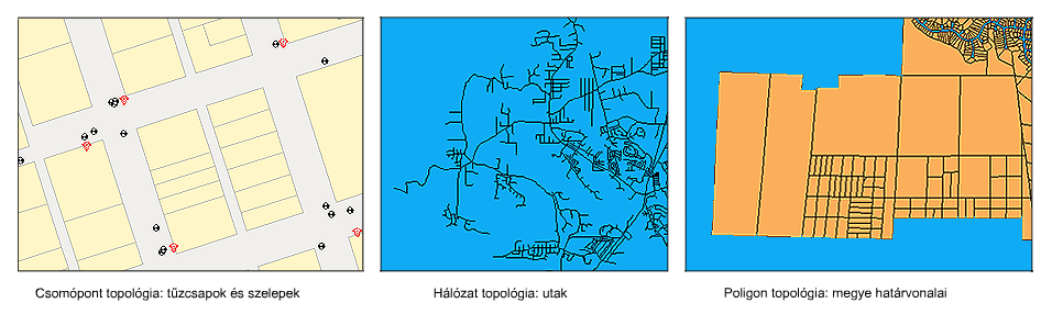 - A poligon topológia olyan poligonokat tartalmaz, melyek zárt területeket alkotnak, például a földparcellák és a népszámlálási körzetek. A szomszédos területek közös határát egyetlen él képviseli.