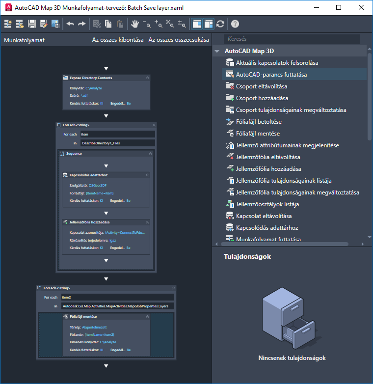 A Munkafolyamat-tervező jobb oldalán lévő Művelet panel a műveletek két kategóriáját tartalmazza. Az AutoCAD Map 3D eszközkészlet műveletei az AutoCAD Map 3D eszközkészlet specifikusak (beleértve az AutoCAD-parancsokat futtató műveleteket is).