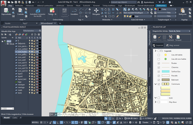 Ez a térkép (a bal oldalon) AutoCAD fóliákat és (a jobb oldalon) Megjelenítéskezelő fóliákat is tartalmaz.
