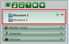 Manages the structure and contains three tabs that can be resized: Model views, Queries and Groups. You can extend or hide the tabs by clicking their title bars.