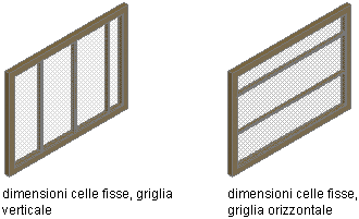 Quando si specifica una dimensione fissa per le celle di una griglia, è possibile stabilire come le celle devono essere regolate per riutilizzare l'eventuale spazio eccedente. Questo spazio è generato quando la lunghezza (o l'altezza) dell'assieme porta/finestra non è perfettamente divisibile per la dimensione fissa della cella.