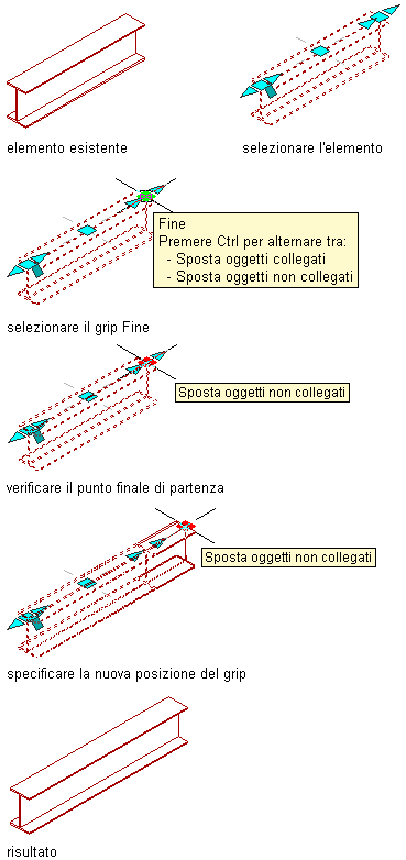 Lo spostamento del grip di Fine nella direzione positiva allunga l'elemento sul proprio asse (percorso), mentre lo spostamento nella direzione negativa lo accorcia.