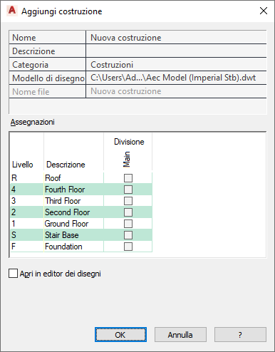 Immettere una descrizione per la costruzione | Fare clic sul campo Descrizione, immettere la descrizione della costruzione, quindi fare clic su OK. |