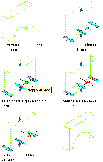 Per modificare il raggio dell'arco all'interno di un elemento massa arco con i grip, attenersi alla procedura descritta di seguito.