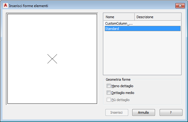 Per inserire in un disegno una o più geometrie definite per una forma personalizzata, attenersi alla procedura indicata di seguito. La geometria potrà quindi essere modificata oppure utilizzata così com'è per definire una delle rappresentazioni di visualizzazione durante la creazione o la modifica di un'altra forma di elemento personalizzata.