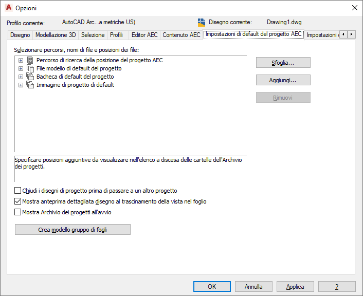 Definizione delle opzioni di Impostazioni di default del progetto AEC per il disegno corrente