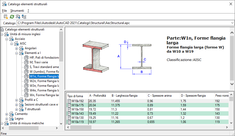 Per creare gli stili della maggior parte delle travi, dei telai e delle colonne standard, è possibile utilizzare il catalogo degli elementi strutturali del AutoCAD Architecture 2026 toolset. Questo catalogo contiene le specifiche per le forme strutturali in legno, acciaio e calcestruzzo standard del settore organizzate in una vista struttura analoga a quella di Esplora file. È possibile sfogliare il catalogo, selezionare una forma e creare uno stile.