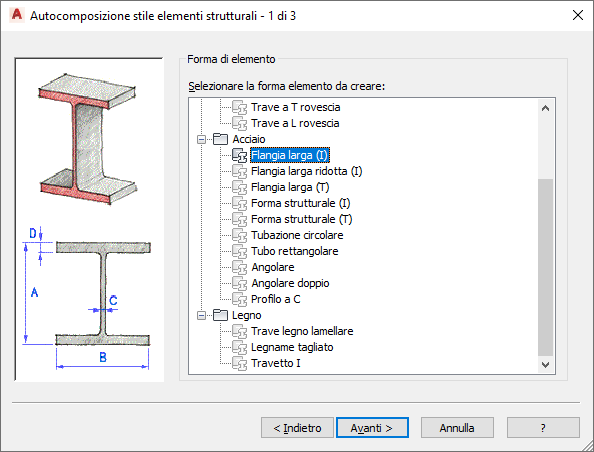 È possibile immettere rapidamente, se conosciuti, i dati relativi al tipo, alla forma e alle quote della forma da creare nell'Autocomposizione stile elementi strutturali. All'interno di uno stile, è possibile creare una forma dell'elemento strutturale basata su una delle forme di elemento presenti nel catalogo.