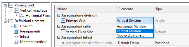 Le divisioni definiscono l'orientamento della griglia (indipendentemente dall'orientamento orizzontale o verticale delle celle e dei montanti verticali) e il tipo di divisione (il numero e la dimensione delle celle).