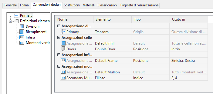 È possibile modificare le definizioni di elementi tramite la scheda Convenzioni design della finestra di dialogo Proprietà stile dell'assieme porta/finestra. È possibile accedere a queste definizioni dall'elenco delle assegnazioni e dall'elenco delle definizioni: