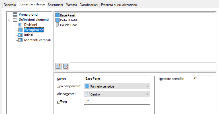 Le modifiche apportate, incluse quelle relative al nome della definizione, sovrascriveranno la definizione esistente. Per creare una nuova definizione dall'elenco delle assegnazioni, selezionare Nuovo dall'elenco degli elementi. Per creare una nuova definizione dall'elenco delle definizioni, fare clic sull'icona Nuova divisione, Nuovo riempimento, Nuovo infisso o Nuovo montante verticale.