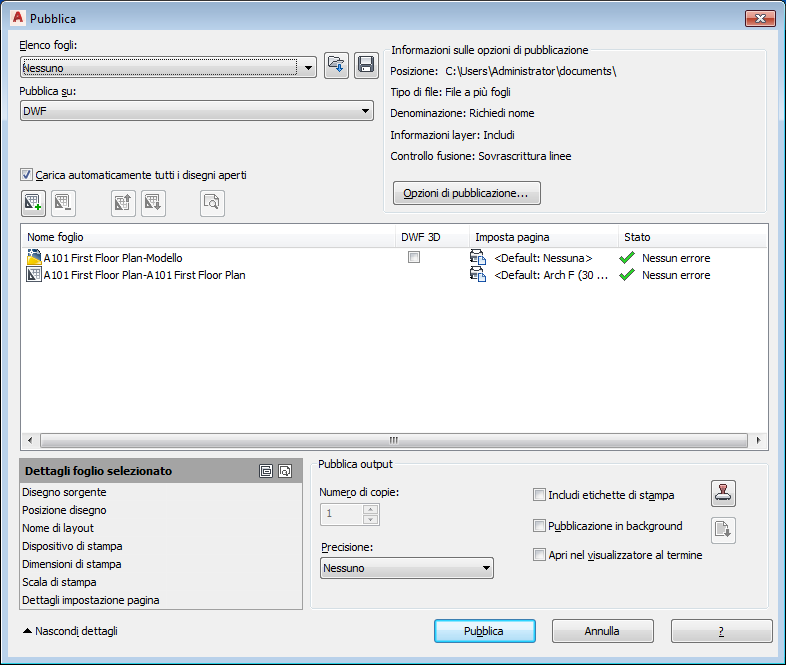 È possibile impostare la pubblicazione automatica dei disegni in formato PDF, DWF o DWFx al momento del salvataggio o della chiusura. Le impostazioni di pubblicazione automatica consentono inoltre di specificare se includere modelli, layout o entrambi e se pubblicare un file a più fogli o ad un solo foglio.