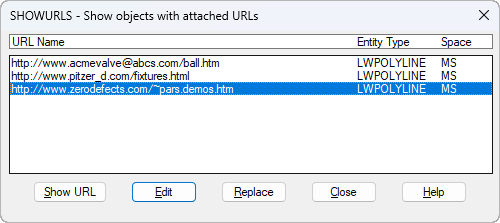 Immettere SHOWURLS per visualizzare la finestra di dialogo Showurls. È possibile fare clic su un singolo URL per visualizzarlo oppure fare clic su uno o più URL per modificarli o sostituirli.