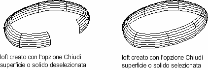 Chiude e apre una superficie o un solido. Quando si utilizza questa opzione, le sezioni trasversali dovrebbero formare un modello a forma di toro in modo che la superficie o il solido di loft possano formare un tubo chiuso. (Variabile di sistema LOFTPARAM)