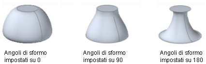Nell'illustrazione che segue viene mostrato l'effetto dell'utilizzo di un angolo di sformo diverso per la prima e l'ultima sezione incrociata di un solido di loft. Alla prima sezione incrociata viene assegnato un angolo di sformo di 45 gradi, mentre all'ultima sezione incrociata viene assegnato un angolo di sformo di 135 gradi.
