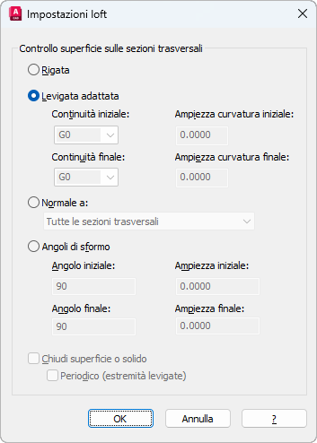 Controlla l'angolo di sformo e l'ampiezza della prima e dell'ultima sezione trasversale della superficie o del solido di loft. L'angolo di sformo è la direzione iniziale della superficie. 0 viene definito come esterno dal piano della curva. (Variabile di sistema LOFTNORMALS)