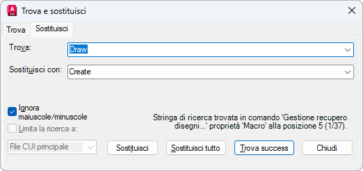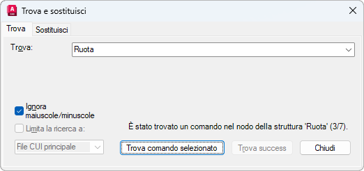 Viene visualizzato un messaggio con i dettagli della posizione del comando, la posizione esatta del comando nel riquadro Personalizzazioni in o nel riquadro Proprietà e il numero di istanze del comando.