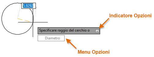 Quando viene richiesto il raggio del cerchio, viene visualizzata l'icona con la freccia rivolta verso il basso alla fine della descrizione comando?