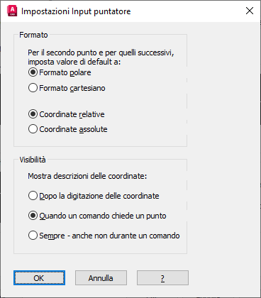 Le impostazioni in Input puntatore incidono sul modo in cui si immettono i valori di coordinate mentre la funzionalità Input dinamico è attiva. Fare clic su Impostazioni per aprire la finestra di dialogo Impostazioni input puntatore.