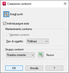 Viene visualizzata la finestra di dialogo Creazione contorni con varie opzioni. Le impostazioni di default sono le migliori opzioni nella maggior parte dei casi. Verificare che il tipo di oggetto sia impostato su Polilinea.