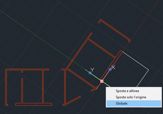 Con l'UCS allineato a questi muri, si potrebbe pensare in che modo è possibile ripristinare lo stato originario. È inoltre possibile selezionare l’icona UCS, posizionare il cursore sul grip di spostamento e scegliere Globale.