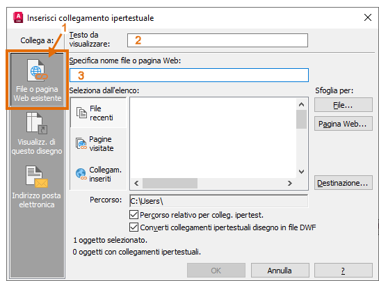 Nella finestra di dialogo Inserisci collegamento ipertestuale, fare clic su File esistente o Pagina Web (1), immettere Autodesk nel campo Testo da visualizzare (2) e immettere https://www.autodesk.it nel campo Specifica nome file o pagina Web (3).