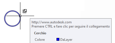 Nota: Se il contrassegno del cursore e la descrizione comando del collegamento ipertestuale non vengono visualizzati come nell'immagine precedente, utilizzare la procedura descritta nella sezione successiva per verificare che all'oggetto sia stato associato un collegamento ipertestuale. Se è stato associato un collegamento ipertestuale, assicurarsi che il contrassegno del cursore e la descrizione comando del collegamento ipertestuale siano attivati immettendo OPZIONICOLLIPERT alla riga di comando e immettendo Sì in risposta a "Visualizzare cursore collegamento ipertestuale, descrizioni e menu di scelta rapida?" .