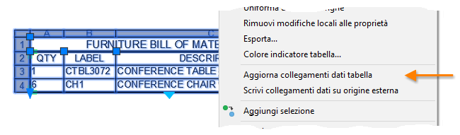 I dati estratti e inseriti in una tabella possono essere aggiornati mediante le impostazioni originali dei dati estratti. Ad esempio, se si aggiungono altri blocchi ad un disegno, è possibile aggiornare il collegamento dati associato ad una tabella per includere gli ultimi conteggi di blocchi anziché dover ripetere il processo di estrazione.