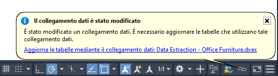 Suggerimento: Quando almeno una tabella in un disegno contiene dati estratti, l'icona Collegamenti dati viene visualizzata sulla barra di sistema della finestra dell'applicazione AutoCAD. Mentre l'icona è visualizzata, è possibile fare clic con il pulsante destro del mouse sull'icona per gestire e aggiornare i collegamenti ai dati in un disegno. La variabile di sistema DATALINKNOTIFY controlla l'aspetto e le funzionalità dell'icona Collegamenti dati.