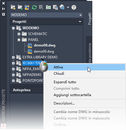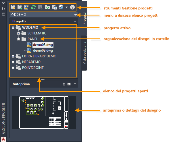 Set di strumenti di AutoCAD Electrical è basato sui progetti. Per progetto si intende un gruppo di disegni correlati. Tutte le informazioni relative ad un progetto, inclusi i disegni contenuti nel progetto, vengono salvate in un file di progetto con estensione .wdp.