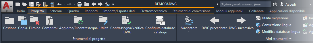 Set di strumenti di AutoCAD Electrical include una barra multifunzione standard, suddivisa in schede, visualizzata nella parte superiore dell'area di disegno. Sono presenti schede specifiche di Set di strumenti di AutoCAD Electrical, oltre alle schede della barra multifunzione di AutoCAD.