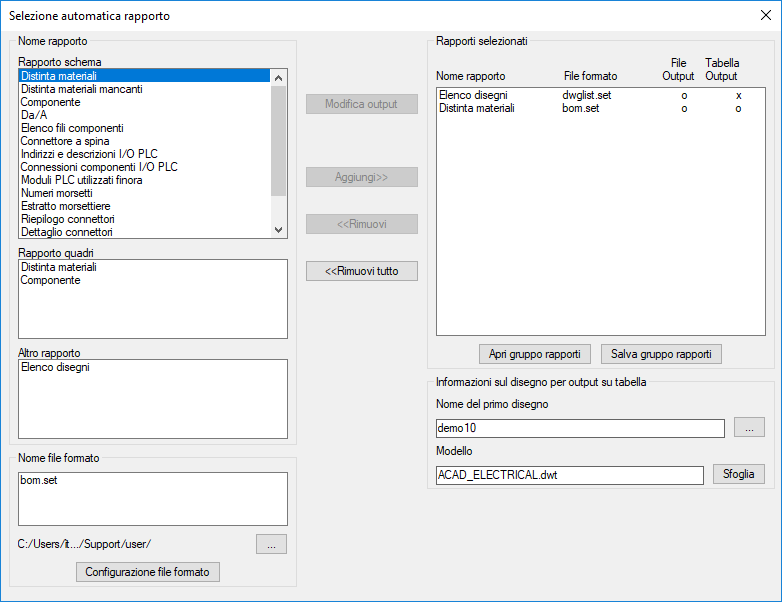 Selezionare il nome rapporto e un file di formato (.set) per ogni rapporto da eseguire. I file di formato devono definire un output su file, un output su tabella o entrambi.
