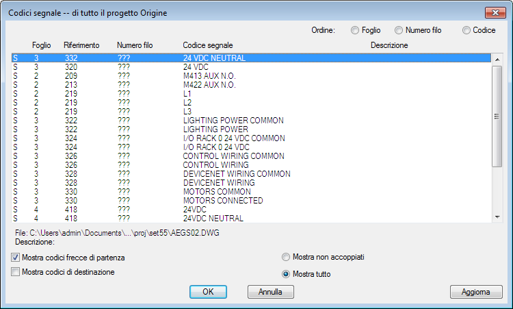 Associazione di un segnale di arrivo a un segmento di filo di una rete di fili e collegamento alla freccia del segnale di partenza.