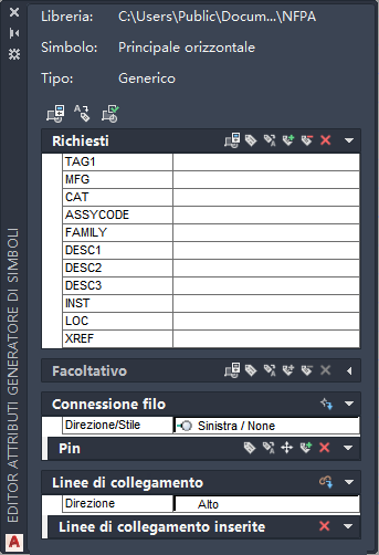 È possibile iniziare da zero o utilizzare un simbolo esistente simile come punto di partenza. Selezionare il tipo di simbolo, il punto di inserimento e l'orientamento. Per i simboli dello schema, è consigliabile creare sia una versione orizzontale che una versione verticale. Il Generatore di simboli agisce nell'ambiente dell'editor blocchi di AutoCAD. Per inserire gli attributi necessari per il tipo di simbolo selezionato, utilizzare la tavolozza dell'editor attributi generatore di simboli.