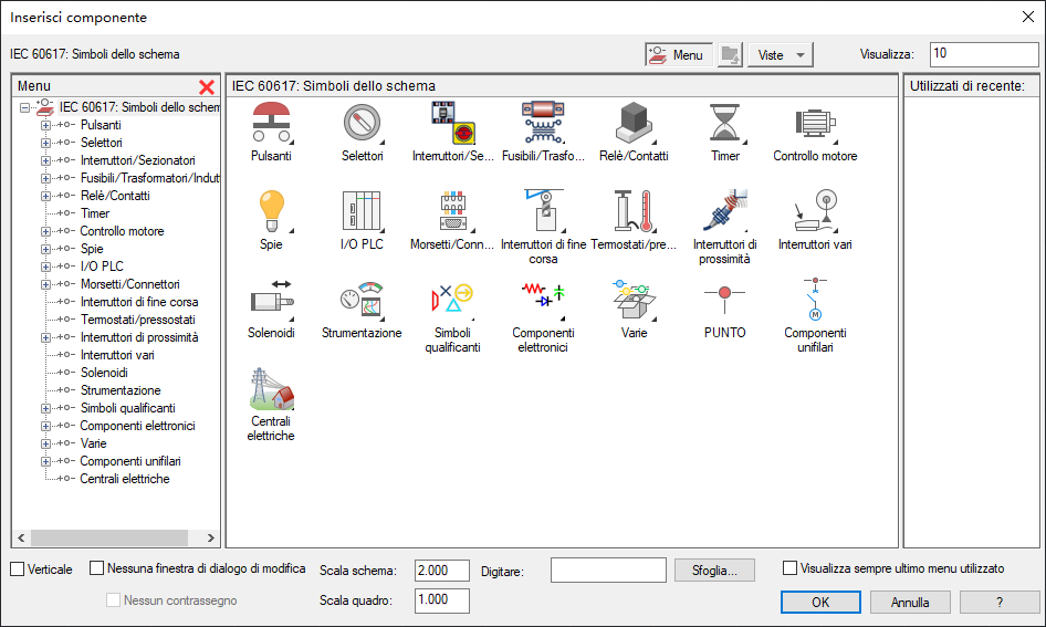 Il menu icone consente di inserire un simbolo selezionando il tipo di simbolo, ad esempio un pulsante NO o un selettore a tre posizioni. Dopo avere inserito il simbolo, è possibile aggiungere annotazioni come descrizioni, informazioni di catalogo e così via.