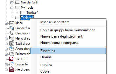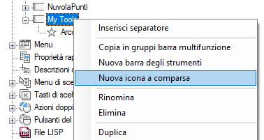 Viene creata una nuova icona a comparsa sulla barra degli strumenti e contemporaneamente viene creata la nuova barra degli strumenti in base al menu a discesa utilizzato.