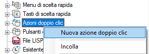 1. Nella scheda Personalizza, nel riquadro Personalizzazioni in <nome file>, fare clic con il pulsante destro del mouse sul nodo Azioni doppio clic. Fare clic su Nuova azione doppio clic.