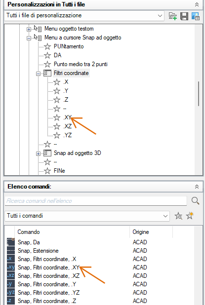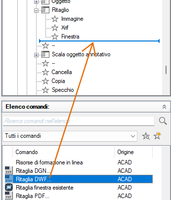 - Nella scheda Personalizza, nel riquadro Elenco comandi, individuare il comando da aggiungere e trascinarlo su un elemento dell'interfaccia utente nel riquadro Personalizzazioni in <nome file>.