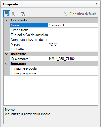 - Nella casella Nome, digitare un nome per il comando. Il valore è utilizzato come nome di default quando viene aggiunto ad un elemento dell'interfaccia utente e all'interno di una descrizione comandi.