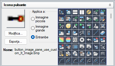 Nel riquadro Icona pulsante, in Applica a, selezionare una delle tre opzioni di assegnazione dell'immagine: Immagine piccola, Immagine grande o Entrambe. Quindi selezionare l'icona da importare dall'elenco di immagini.