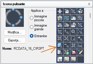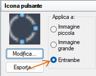 Nel riquadro Icona pulsante, in Applica a, selezionare una delle tre opzioni di assegnazione dell'immagine: Immagine piccola, Immagine grande o Entrambe.