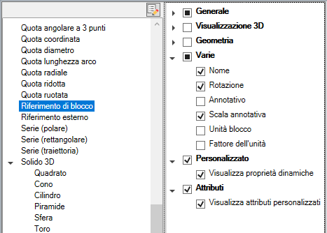 Controllo della visualizzazione di attributi e proprietà personalizzate per i riferimenti di blocco