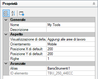 Nota: Le modifiche apportate in questa fase alle proprietà di una barra degli strumenti incidono esclusivamente sull'aspetto iniziale della barra degli strumenti dopo il caricamento del file di personalizzazione (CUIx). È preferibile utilizzare un'area di lavoro per controllare l'aspetto di una barra degli strumenti.