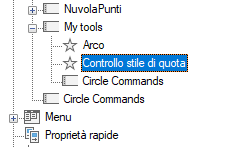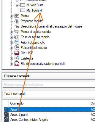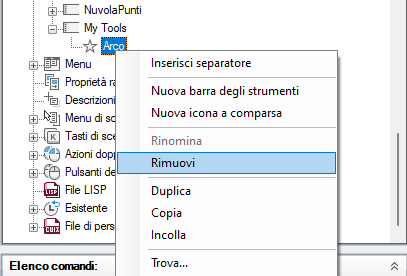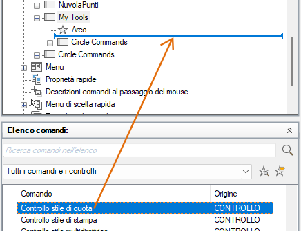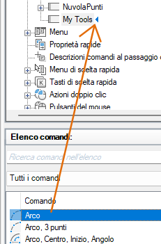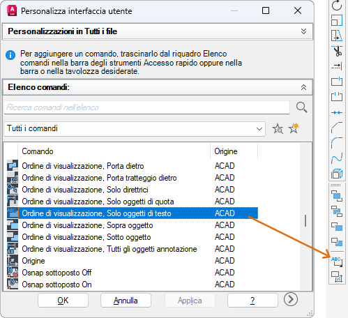 - Nel riquadro Elenco comandi, trascinare il comando da aggiungere alla barra degli strumenti nel riquadro Personalizzazioni in <nome file>.