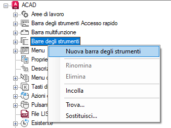 - Nella scheda Personalizza, nel riquadro Personalizzazioni in <nome file>, fare clic con il pulsante destro del mouse sul nodo Barre degli strumenti e scegliere Nuova barra degli strumenti.