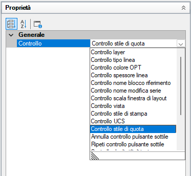 - Nella casella Controllo del riquadro Proprietà, fare clic sulla freccia rivolta verso il basso per visualizzare un elenco di tutti i controlli della barra degli strumenti disponibili.