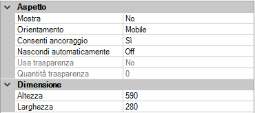 Nota: Per specificare che una finestra deve essere ancorata, impostare Orientamento su Sinistra, Destra, Alto o Basso e Nascondi automaticamente su On.